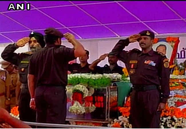 नयी दिल्ली : पठानकोट में आईईडी को डिफ्यूज करने के दौरान शहीद हुए एनएसजी के लेफ्टिनेंट कर्नल निरंजन के अंतिम संस्कार से पहले सेना के जवानों ने आज पलक्कड़ मेंउन्हें सलामी दी. एनएसजी के बम निरोधक दस्ते में शामिल 32 वर्षीय निरंजन पठानकोट वायुसेना स्टेशन में एक आईईडी को निष्क्रिय करते समय शहीद हो गये थे.