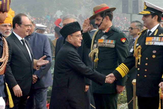 जनरल आफिसर कमांडिंग, दिल्ली लेफ्टिनेंट जनरल राजन रवीन्द्रन के नेतृत्व में सेना और पुलिस के दस्ते बैंड की मनमोहक धुनों पर सधे कदमों से राजपथ पर सलामी मंच से गुजरे और वहां देश की तीनों सेनाओं के सर्वोच्च कमांडर राष्ट्रपति प्रणब मुखर्जी ने उनकी सलामी ली. सैनिकों ने सलामी के तौर पर दाएं पैर को कंधे तक उठाकर पूरी धमक के साथ मातृभूमि पर टिकाते हुए जब एक साथ राष्ट्रपति की तरफ मुड़कर देखा तो जैसे पूरा राष्ट्र उनकी वीरता के आगे नतमस्तक हो गया. इससे पूर्व तीन दिन की राजकीय यात्रा पर भारत आए ओलांद राष्ट्रपति के साथ राजपथ पर पहुंचे जहां प्रधानमंत्री मोदी ने उनकी अगवानी की और उन्हें तीनों सेनाओं थल सेना, वायु सेना और नौसेना के प्रमुखों से मिलवाया.