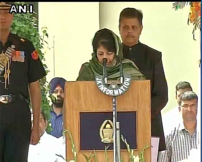श्रीनगर : पीडीपी अध्यक्ष महबूबा मुफ्ती ने आज जम्मू कश्मीर की पहली महिला मुख्यमंत्री के रुप में शपथ ली. उनके बाद भाजपा नेता डॉ निर्मल सिंह ने उपमुख्यमंत्री पद की शपथ ली.मुख्यमंत्री पद की शपथ लेने के बाद वह पहली मुस्लिम महिला मुख्यमंत्री बन गयीं जो भाजपा के साथ गठबंधन सरकार का नेतृत्व करेंगी. पीडीपी के संस्थापक मुफ्ती मोहम्मद सईद की पुत्री 56 वर्षीय महबूबा ने सोमवार सुबह 11 बजे जम्मू स्थित राजभवन में पद एवं गोपनीयता की शपथ ली. महबूबा का मुख्यमंत्री के रुप में शपथ लेना जम्मू कश्मीर ही नहीं बल्कि शेष देश के इतिहास में भी एक महत्वपूर्ण घटना है.