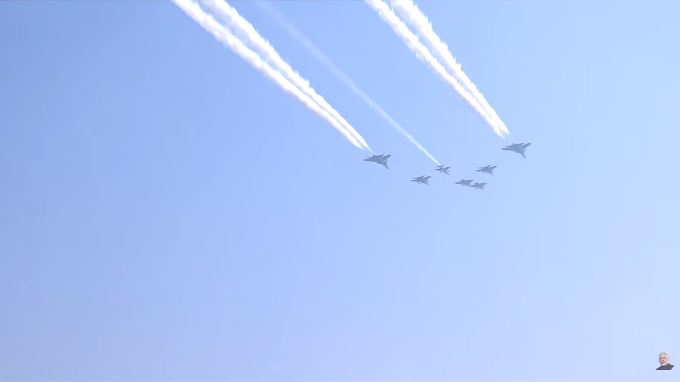 एक अकेला राफेल फाइटर जेट 900 किलोमीटर प्रति घंटे की स्पीड से उड़ते हुए कर्तव्य पथ के ऊपर शानदार वर्टिकल पैंतरेबाज़ी की. इस एयरक्राफ्ट को ग्रुप कैप्टन अमित गेहानी और 17वीं स्क्वाड्रन के फ्लाइट लेफ्टिनेंट उत्कर्ष शर्मा उड़ा रहे थे, जिसे गोल्डन एरो के नाम से जाना जाता है.