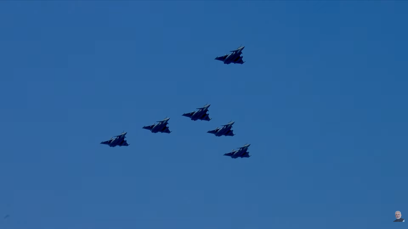 दिल्ली के कर्तव्य पथ पर 77वें गणतंत्रदिवस परेड के दौरान वज्रांग फॉर्मेशन में 6 राफेल विमान ‘वज्रांग’ फॉर्मेशन में उड़े.