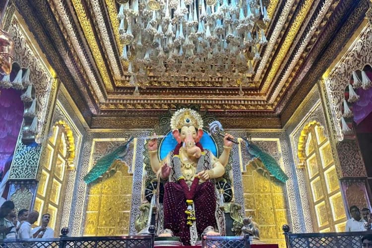 मुंबई में गणेश चतुर्थी का उत्सव बहुत ही धूमधाम से मनाया जाता है. हर साल इस खास अवसर पर मुंबई में लालबागचा राजा की भव्य स्थापना की जाती है. इस साल भी उनकी भव्य मूर्ति का दर्शन लोगों के लिए खुला है. दूर-दूर से श्रद्धालु लालबागचा राजा के दर्शन करने के लिए आते हैं, और कई फिल्मी सितारे भी इस पावन अवसर पर बप्पा की एक झलक पाने के लिए पंडाल में पहुंचते हैं. इस वर्ष यह स्थापना 91वें साल में प्रवेश कर चुकी है. शनिवार 7 सितंबर यानी आज सुबह 4 बजे प्राण प्रतिष्ठा की गई, और 6 बजे से आम नागरिकों के लिए दर्शन की शुरुआत हो गई. इस बार गणपति की मूर्ति को बेहद शानदार तरीके से सजाया गया है, जिसमें सोने के आभूषण और मुकुट का इस्तेमाल हुआ है. सिंहासन पर बैठे गणरति बप्पा को मरून वस्त्र पहनाए गए हैं. खासतौर पर बप्पा का मुकुट इस बार सभी का ध्यान अपनी ओर खींच रहा है.