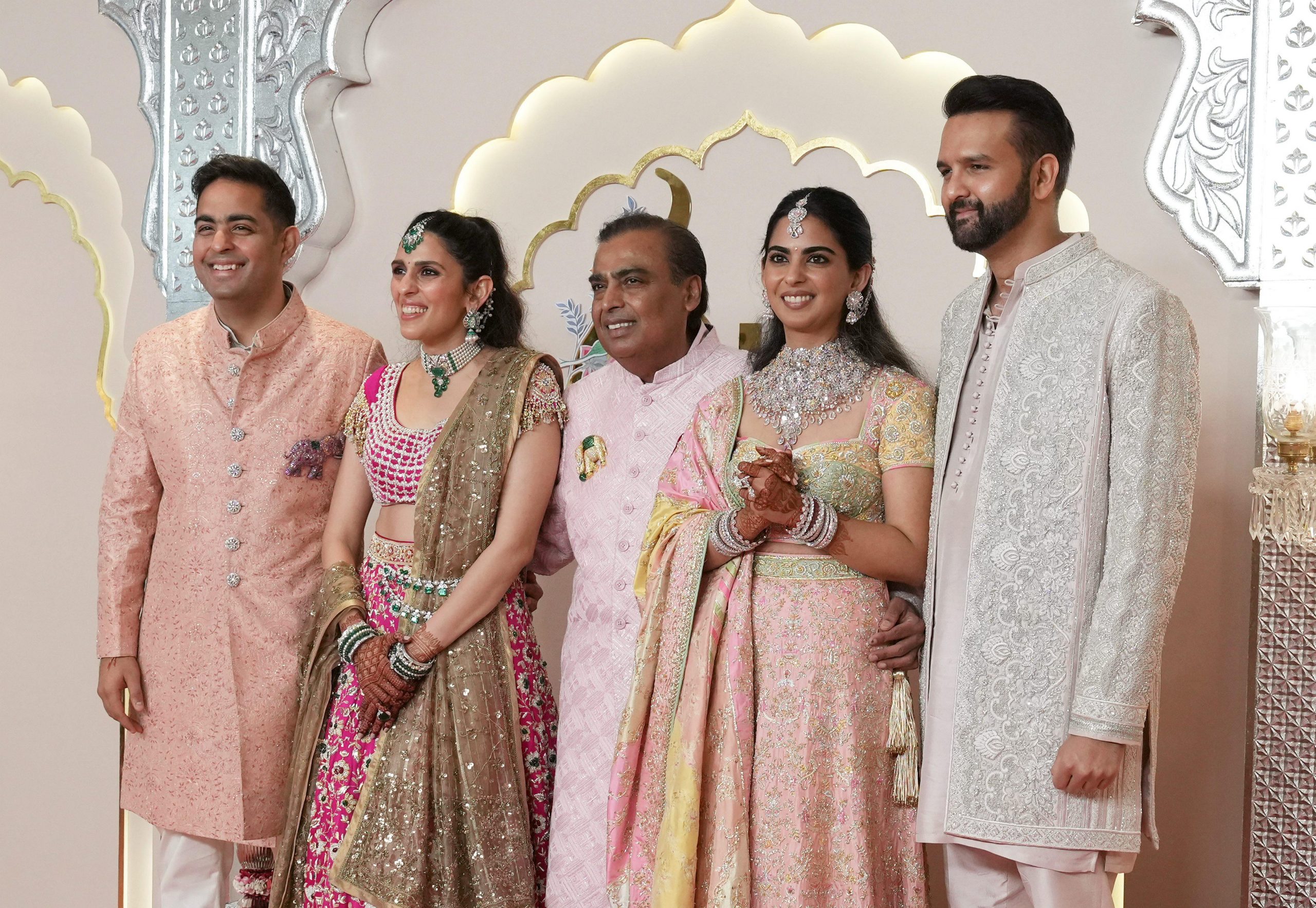 उद्योगपति मुकेश अंबानी रिलायंस जियो इन्फोकॉम लिमिटेड के अध्यक्ष आकाश अंबानी और उनकी पत्नी श्लोका मेहता, रिलायंस इंडस्ट्रीज लिमिटेड की निदेशक ईशा अंबानी और उनके पति आनंद पीरामल मुंबई के जियो वर्ल्ड कन्वेंशन सेंटर पहुंचे. अनंत अंबानी आज मुंबई में राधिका मर्चेंट के साथ शादी के बंधन में बंधेंगे.