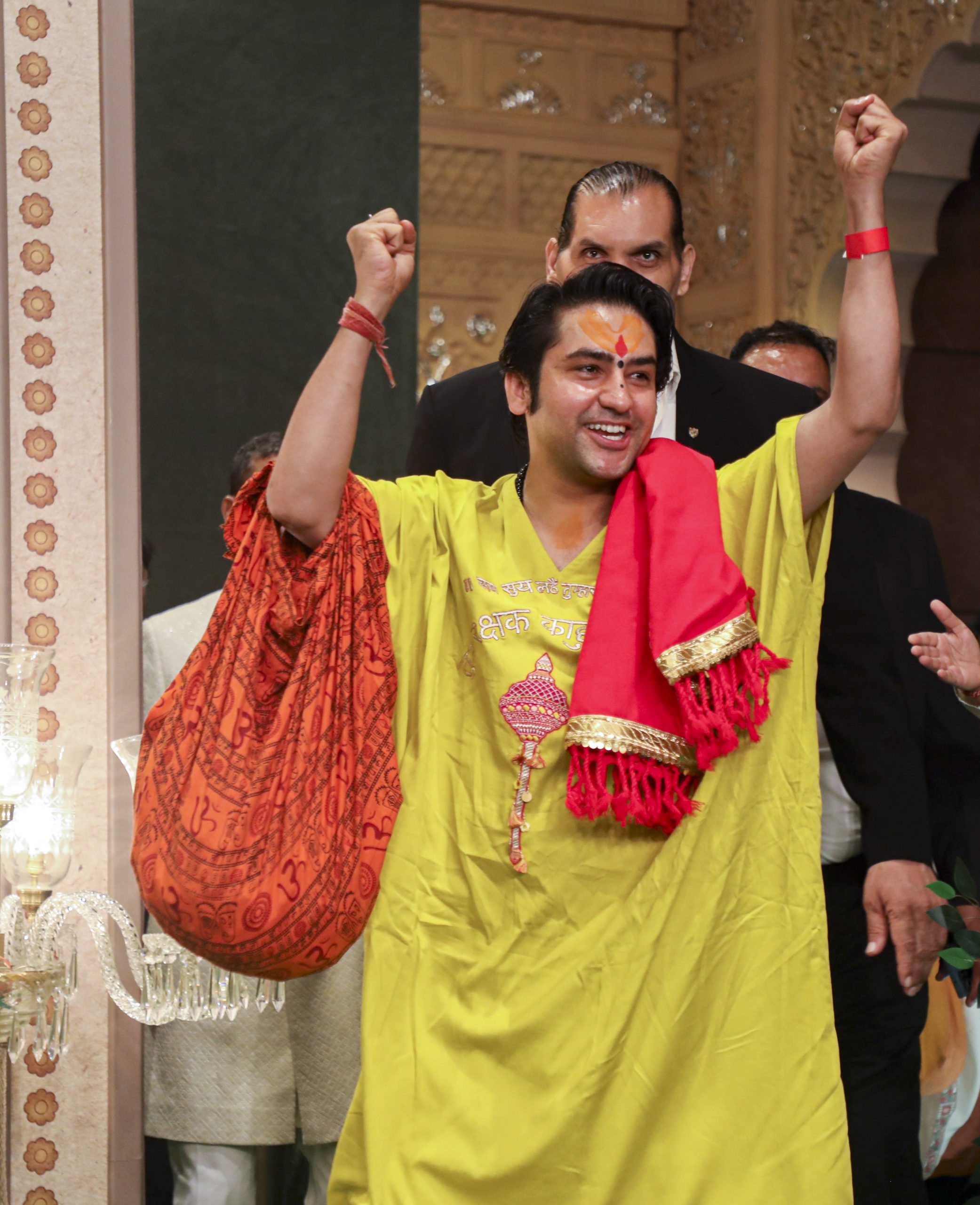 अनंत अंबानी और उनकी पत्नी राधिका को आशीर्वाद देने के आचार्य धीरेंद्र शास्त्री भी पहुंचे. इस दौरान उन्हें समारोह में मौजूद आध्यात्मिक गुरु स्वामी अवधेशानंद गिरि के साथ देखा गया.