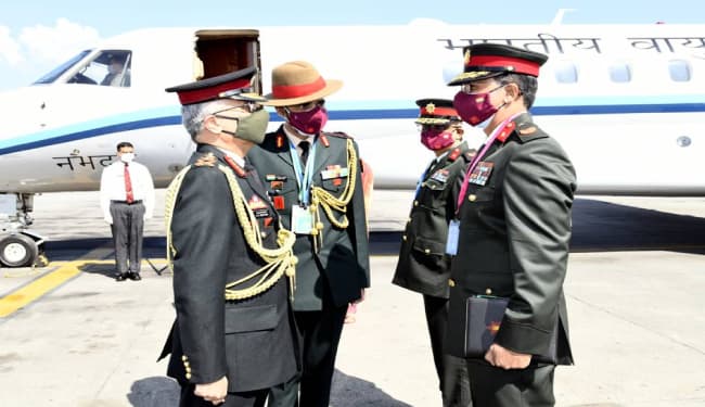 नेपाल की राजधानी काठमांडू के त्रिभुवन हवाई अड्डे पर भारतीय सेना प्रमुख और उनकी पत्नी बीना नरवणे का नेपाली सेना के अधिकारी प्रभुराम शर्मा और सुनीता शर्मा द्वारा स्वागत किया गया. मालूम हो कि जनरल नरवणे को पांच नवंबर, 2020 को राष्ट्रपति भवन में आयोजित एक समारोह में राष्ट्रपति विद्या देवी भंडारी नेपाल सेना के जनरल की उपाधि से सम्मानित करेंगी.