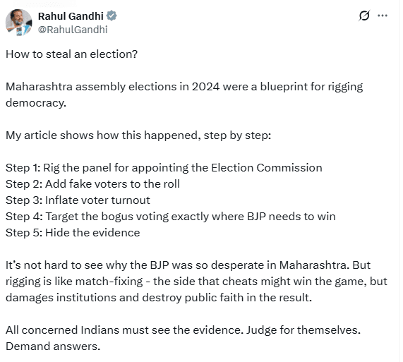 शनिवार को सोशल मीडिया एक्स पर पोस्ट कर राहुल गांधी ने चुनाव में कथित अनियमितता के बारे में चरणबद्ध तरीके से बताया कि कैसे मतदाता सूची में फर्जी मतदाता जोड़े गए, मतदान प्रतिशत बढ़ा चढ़ा कर दिखाए गए, फर्जी मतदान कराए गए और बाद में सबूत छिपाए गए. गांधी ने कुछ अखबारों में प्रकाशित लेख की तस्वीर साझा करते हुए लिखा ‘चुनाव की चोरी का पूरा खेल! 2024 में महाराष्ट्र विधानसभा चुनाव लोकतंत्र में धांधली का ब्लूप्रिंट था.’ उन्होंने लिखा, ‘‘मैंने अपने लेख में चरण दर चरण विस्तार से बताया है कि कैसे यह साजिश रची गई.