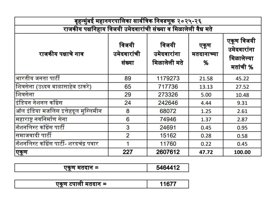 यह भी पढ़ें : BMC Election Result 2026: ठाकरे परिवार के गढ़ में बीजेपी की सेंध, 118 सीटों पर जीत, BMC में महायुति का होगा मेयर