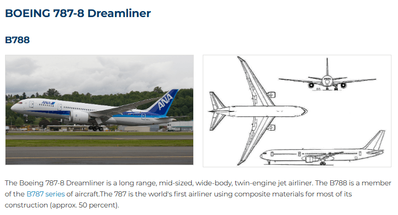 वेबसाईट skybrary.aero के अनुसार Boeing 787-8 Dreamliner दुनिया का पहला ऐसा कमर्शियल विमान है, जिसकी निर्माण सामग्री का 50% हिस्सा कंपोजिट मटेरियल से बना होता है, जिससे यह हल्का और अधिक ईंधन-कुशल बनता है. यह एक मिड-साइज, वाइड-बॉडी, ट्विन इंजन जेट एयरलाइनर है.