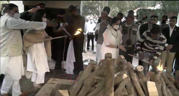 सीडीएस बिपिन रावत और उनकी पत्नी का अंतिम संस्कार पूर्ण सैन्य सम्मान के साथ किया गया. सेना के बैंड की धुन के साथ उन्हें 17 तोपों की सलामी दी गयी. जनरल रावत और उनकी पत्नी के पार्थिव शरीर के लिए एक ही चिता सजायी गयी थी और दोनों का अंतिम संस्कार साथ ही हुआ.