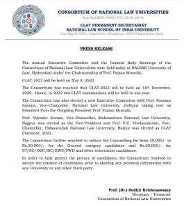 इच्छुक अभ्यर्थी आधिकारिक वेबसाइट consortiumofnlus.ac.in पर जाकर आवेदन कर सकते हैं.बता दें कि लॉ एंट्रेंस टेस्ट ग्रेजुएट(यूजी) औऱ पोस्ट ग्रेजुएट(पीजी) दोनों के लिए आयोजित होता है. CLAT यूजी के लिए छात्रों के लिए प्रतियोगिता परीक्षा में 45 फीसदी अंक या उसके सामांतर और CLAT पीजी के लिए 50 फीसदी अंक लाने होंगे. हालांकि आरक्षण के तौर पर अंकों में छूट दी गई है. बता दें कि CLAT की परीक्षा का पहली बार एक साल में दो बार आयोजन होने जा रहा है. CLAT 2022 8 मई को आयोजित होगा जबकि CLAT 2023 18 दिसंबर 2022 को आयोजित होगा. बता दें कि CLAT परीक्षा का आयोजन 22 राष्ट्रीय विधि विश्वविद्यालयों में नामांकन के लिए किया जाएगा. जिसमें छात्र 5 साल के एकीकृत एलएलबी और एलएलएम कोर्स ऑफर होता है.