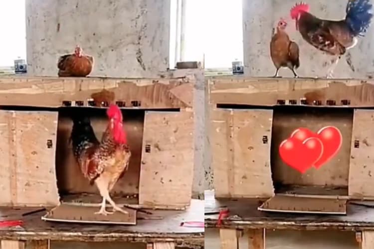 मुर्गी ने पिंजरा खोलकर मुर्गा को जैसे ही आजाद करती है, वो खुशी से झूम उठता है. उड़कर पिंजरे के ऊपर बैठ जाता है, जहां पहले से मुर्गी बैठी इंतजार कर रही है. मुर्गा खुश होकर मुर्गी को किस देता है. उसके बाद मुर्गी ने उसे अपने पंख से सहलाने लगी है और मुर्गा पंख के नीचे आराम से बैठ जाता है. मुर्गा और मुर्गी की प्रेम कहानी किसी फिल्म की स्टोरी से कम नहीं है.