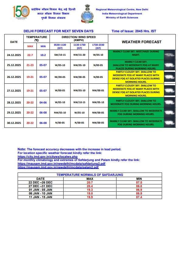 दिल्ली को प्रदूषण के उच्च स्तर से गुरुवार सुबह थोड़ी राहत मिली और वायु गुणवत्ता सूचकांक (एक्यूआई) 220 दर्ज किया गया, जो ‘खराब’ श्रेणी में आता है. आईएमडी के अनुसार, दिल्ली में न्यूनतम तापमान 6.5 डिग्री सेल्सियस दर्ज किया गया, जो सामान्य से एक डिग्री कम है. 26 और 27 दिसंबर को राजधानी का न्यूनतम तापमान 5 से 7 डिग्री सेल्सियस के बीच रिकॉर्ड किया जा सकता है. इसके बाद तापमान में और गिरावट देखने को मिलेगी.