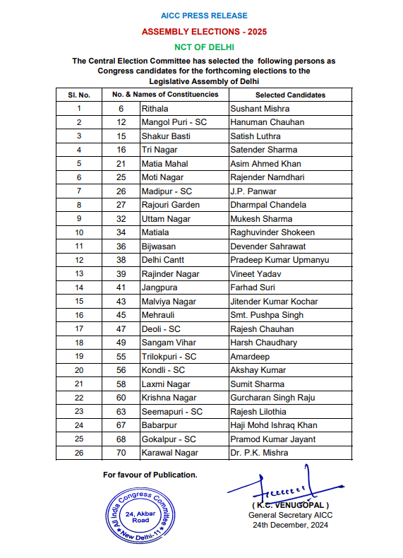 Delhi Elections 2025 Congress releases second list : कांग्रेस ने दिल्ली विधानसभा चुनाव 2025 के लिए मंगलवार को देर रात 26 उम्मीदवारों की दूसरी सूची जारी कर दी है. दिल्ली विधानसभा चुनाव अगले साल फरवरी की शुरुआत में होने की संभावना है.