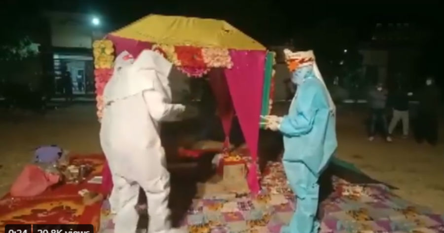 इसी फेहरिस्त में शामिल है एक वीडियो जो राजस्थान के बारा जिला, शाहाबाद का है. इस वीडियो में एक जोड़ा पीपीई किट पहन कर शादी की रस्में निभाता नजर आ रहा है. यह बारा के केलवाड़ा कोविड सेंटर का वीडियो है. दरअसल ऐन शादी के दिन दुल्हन की कोरोना रिपोर्ट पॉजिटिव आ गयी जिसके बाद जोड़े ने पीपीई किट पहनकर शादी करने का फैसला किया. इस शादी समारोह में सरकार द्वारा निर्धारित कोरोना के तमाम प्रोटोकॉल का पालन किया गया.