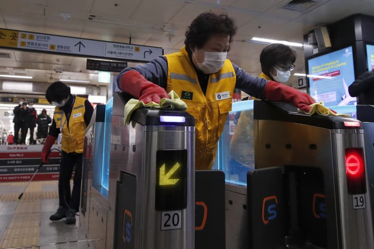 Seoul: Workers wearing a face mask disinfect as a precaution against the new coronavirus at a subway station in Seoul, South Korea, Wednesday, March 4, 2020. AP/PTI(AP04-03-2020_000037B)