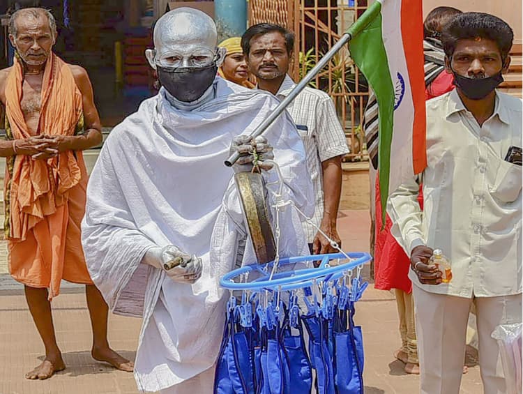 कोरोना संकट के दौरान देशभर में कई कोरोना वारियर्स हैं जो लोगों को मदद के लिए बढ़चढ़ कर आगे आ रहे हैं. इस बीच ओडिशा की एक तसवीर सोशल मीडिया पर तेजी से वायरल हो रही है. तसवीर में महात्मा गांधी का ड्रेस पहना व्यक्ति लोगों के बीच पहुंचकर मास्क और सैनिटाइजर बांट रहा है.