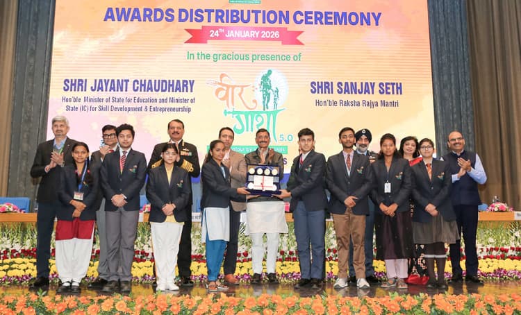 रक्षा राज्य मंत्री संजय सेठ और शिक्षा एवं कौशल विकास एवं उद्यमिता राज्य मंत्री (स्वतंत्र प्रभार) जयंत चौधरी ने शनिवार को नयी दिल्ली में वीर गाथा 5.0 के सुपर-100 विजेताओं को सम्मानित किया. रक्षा राज्य मंत्री ने उन्हें बधाई देते हुए कहा कि आप विकसित भारत 2047 के ब्रांड एंबेसडर हैं. वीर गाथा जैसी पहल से यह सुनिश्चित होगा कि आने वाली पीढ़ियां भारत के महान स्वतंत्रता सेनानियों के बलिदानों को याद रखें और उनका सम्मान करें. उन्होंने युवा प्रतिभागियों से सरदार पटेल, बिरसा मुंडा, साहिबजादे और स्वामी विवेकानंद जैसे राष्ट्रीय व्यक्तित्वों से प्रेरणा लेने का आग्रह किया, जिनके साहस, समर्पण और बलिदान राष्ट्र को प्रेरित करते रहेंगे और इतिहास में अंकित रहेंगे.