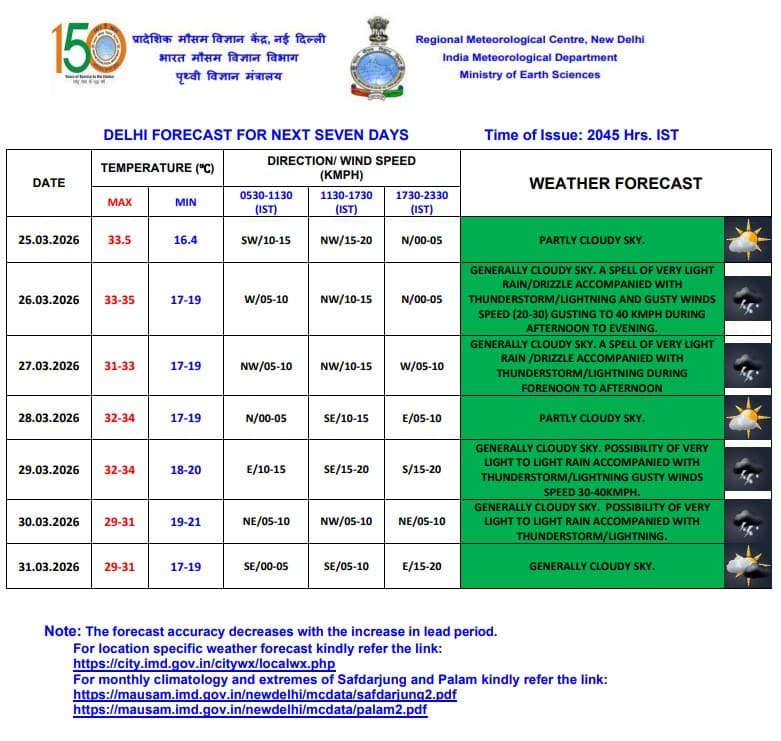 दिल्ली में आने वाले दिनों में मौसम करवट लेता नजर आएगा. आईएमडी (IMD) के अनुसार, 26 और 27 मार्च को हल्की बारिश, गरज-चमक और 20–40 किमी/घंटा की तेज हवाएं चलने की संभावना है. 28 मार्च को मौसम थोड़ा साफ रहेगा, जबकि 29 और 30 मार्च को फिर से बादल छाए रहेंगे. इस दौरान हल्की बारिश के आसार हैं. बिजली चमकने और तेज हवाओं का भी असर दिख सकता है. 31 मार्च को आसमान में बादल छाए रहेंगे. अधिकतम तापमान करीब 29 से 35 डिग्री के बीच रहेगा, जिससे दिन में हल्की गर्मी महसूस होगी.