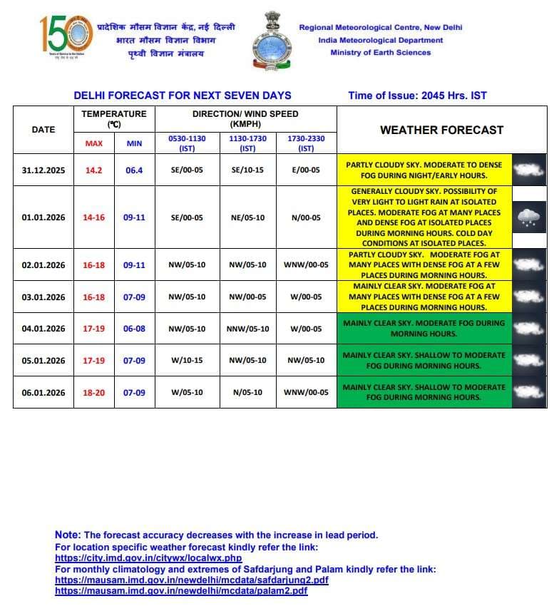 मौसम विभाग के मुताबिक, पंजाब और हरियाणा के ऊपर चक्रवाती परिसंचरण बना हुआ है जिसका असर मौसम पर पड़ सकता है. नए साल के पहले दिन दिल्ली और एनसीआर में बहुत हल्की या छिटपुट बारिश होने की थोड़ी संभावना है. अगर बारिश होती है, तो यह इस मौसम की पहली बारिश दर्ज की जाएगी. विभाग ने बताया कि 3 जनवरी से राजधानी में शीत लहर चल सकती है, क्योंकि न्यूनतम तापमान 10 डिग्री सेल्सियस से नीचे रिकॉर्ड किया जा सकता है. साथ ही हिमालयी क्षेत्रों से ठंडी उत्तरी हवाएं दिल्ली की ओर बढ़ने की संभावना है, जिससे ठंड और बढ़ेगी.