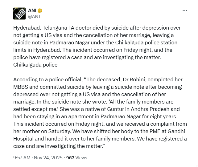 एक पुलिस अधिकारी ने मामले को लेकर जानकारी दी. उनके अनुसार, डॉक्टर रोहिणी ने एमबीबीएस पूरा किया था और अमेरिका का वीजा न मिलने तथा शादी टूट जाने से वह परेशान थी. इसी तनाव में उन्होंने सुसाइड नोट लिखकर आत्महत्या कर ली.