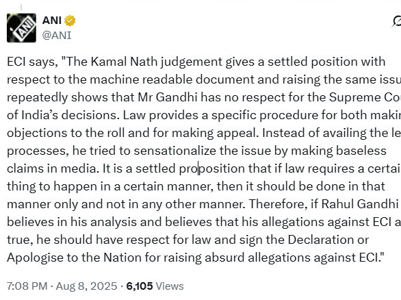 भारत चुनाव आयोग ने कहा कि “कमलनाथ का फैसला मशीन द्वारा पढ़े जा सकने वाले दस्तावेज के संबंध में एक स्थापित स्थिति देता है और एक ही मुद्दे को बार-बार उठाना दर्शाता है कि राहुल गांधी को भारत के सुप्रीम कोर्ट के निर्णयों का कोई सम्मान नहीं है. कानून रोल पर आपत्ति दर्ज करने और अपील करने, दोनों के लिए एक विशिष्ट प्रक्रिया प्रदान करता है. कानूनी प्रक्रियाओं का लाभ उठाने के बजाय, उन्होंने मीडिया में निराधार दावे करके इस मुद्दे को सनसनीखेज बनाने की कोशिश की. यह एक स्थापित प्रस्ताव है कि यदि कानून किसी निश्चित चीज़ को एक निश्चित तरीके से करने की आवश्यकता रखता है, तो उसे केवल उसी तरीके से किया जाना चाहिए, किसी अन्य तरीके से नहीं.