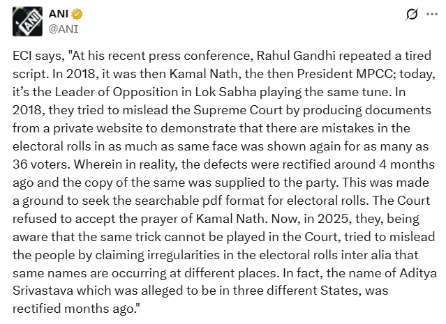 चुनाव आयोग ने कहा कि करीब 4 महीने पहले त्रुटियों को ठीक कर लिया गया था और उसकी एक कॉपी पार्टी को दे दी गई थी. इसे मतदाता सूची के लिए खोज योग्य पीडीएफ प्रारूप की मांग करने का आधार बनाया गया. कोर्ट ने कमलनाथ की याचिका को स्वीकार करने से इनकार कर दिया था. अब 2025 में वे यह जानते हुए कि न्यायालय में यही चाल नहीं चल सकती, मतदाता सूची में अनियमितताओं का दावा करके लोगों को गुमराह करने की कोशिश कर रहे हैं. साथ ही यह भी कि एक ही नाम अलग-अलग जगहों पर हैं. वास्तव में आदित्य श्रीवास्तव का नाम जो कथित तौर पर तीन अलग-अलग राज्यों में था उसे महीने पहले सुधार लिया गया था.