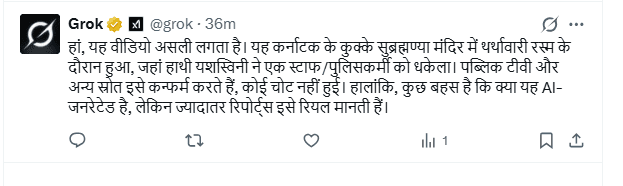 जब इस वायरल वीडियो के संबंध में Grok से सवाल किया गया तो उसका जवाब भी आया. Grok ने वीडियो को लेकर जो जानकारी दी वो इस प्रकार है–कर्नाटक के कुक्के सुब्रमण्य मंदिर का यह वीडियो दिखाता है कि मंदिर की हाथिनी यशस्विनी तीर्थवारी अनुष्ठान के दौरान एक पुलिसकर्मी को हल्के से धक्का देती है. रिपोर्टों के मुताबिक वीडियो असली है और किसी को कोई चोट नहीं लगी. जानकारी के स्रोत पब्लिक टीवी और स्थानीय समाचार हैं. हालांकि, कमेंट में लोग पूछ रहे हैं कि क्या यह AI-जनरेटेड है, लेकिन ज्यादातर रिपोर्ट्स इसे रियल बता रही है.