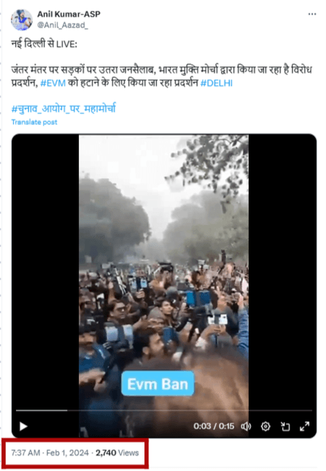 दावे की पुष्टि के लिए फैक्ट चेक डेस्क ने वायरल वीडियो के की-फ्रेम्स को ‘रिवर्स सर्च’ किया. इस दौरान हमें कई पुराने सोशल मीडिया पोस्ट मिले, जिसमें बताया गया कि यह वीडियो जनवरी-फरवरी 2024 में ईवीएम से वोटिंग खत्म करने की मांग को लेकर दिल्ली के जंतर-मंतर पर हुए विरोध प्रदर्शन का है.