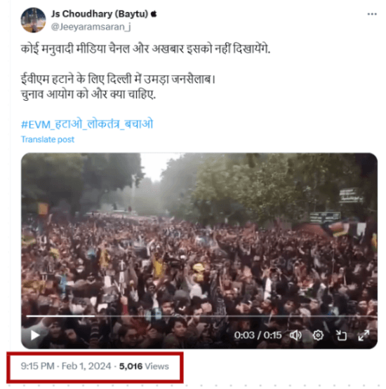 सोशल मीडिया प्लेटफॉर्म ‘एक्स’ पर जेएस चौधरी नामक यूजर ने 1 फरवरी 2024 को वायरल वीडियो से बिल्कुल मिलता-जुलता एक वीडियो शेयर करते हुए लिखा, ‘कोई मनुवादी मीडिया चैनल और अखबार इसको नहीं दिखायेगा. ईवीएम हटाने के लिए दिल्ली में उमड़ा जनसैलाब. चुनाव आयोग को और क्या चाहिए.’ पोस्ट का लिंक, आर्काइव लिंक और स्क्रीनशॉट यहां देखें.