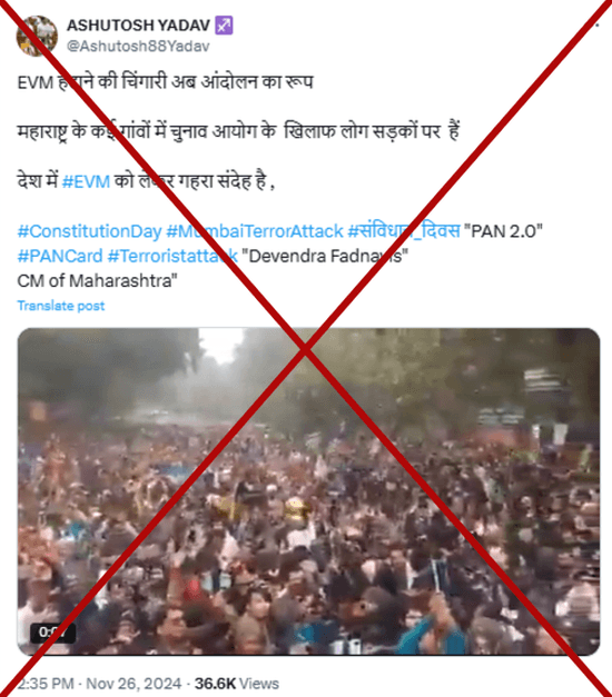 सोशल मीडिया प्लेटफॉर्म ‘एक्स’ (पूर्व में ट्विटर) पर ‘आशुतोष यादव’ नामक यूजर लिखते हैं, ‘EVM हटाने की चिंगारी अब आंदोलन का रूप ले चुका है. महाराष्ट्र के कई गांवों में चुनाव आयोग के खिलाफ लोग सड़कों पर हैं, देश में #EVM को लेकर गहरा संदेह है.’ पोस्ट का लिंक, आर्काइव लिंक और स्क्रीनशॉट यहां देखें.