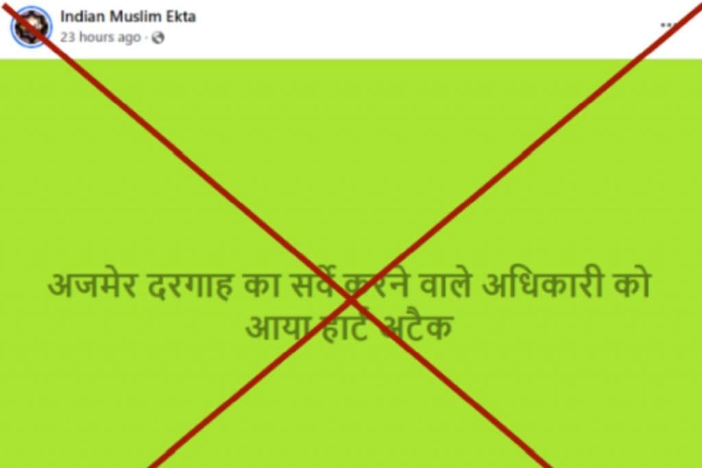 ‘इंडिया मुस्लिम एकता’ नाम के फेसबुक यूजर ने 11 दिसंबर को एक पोस्ट शेयर करते हुए लिखा, “अजमेर दरगाह का सर्वे करने वाले अधिकारी को आया हार्ट अटैक” पोस्ट का लिंक, आर्काइव लिंक और स्क्रीनशॉट यहां देखें.