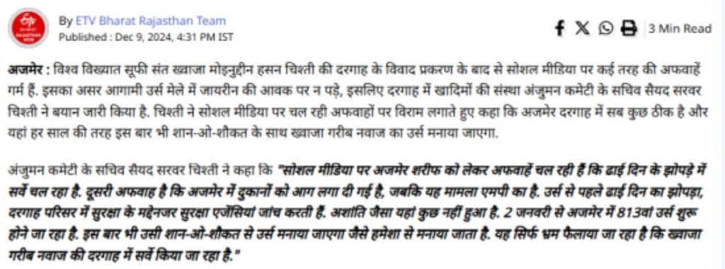 ईटीवी भारत की वेबसाइट पर 9 दिसंबर 2024 को प्रकाशित रिपोर्ट में बताया गया कि सोशल मीडिया पर अजमेर शरीफ को लेकर सिर्फ अफवाह और भ्रम फैलाया जा रहा है. ईटीवी से बातचीत में अंजुमन कमेटी के सचिव सरवर चिश्ती ने कहा कि ऐसा संभव नहीं है कि यहां सर्वेक्षण की अनुमति दी जाए और मीडिया को पता न हो और भारत में इस बारे में कोई चर्चा न हो. ख्वाजा गरीब नवाज में करोड़ों लोगों की आस्था है. सोशल मीडिया पर अजमेर शरीफ को लेकर सिर्फ अफवाह और भ्रम फैलाया जा रहा है. आप उर्स के दौरान दरगाह पर आएं, यहां अमन-चैन के साथ सभी का स्वागत है.