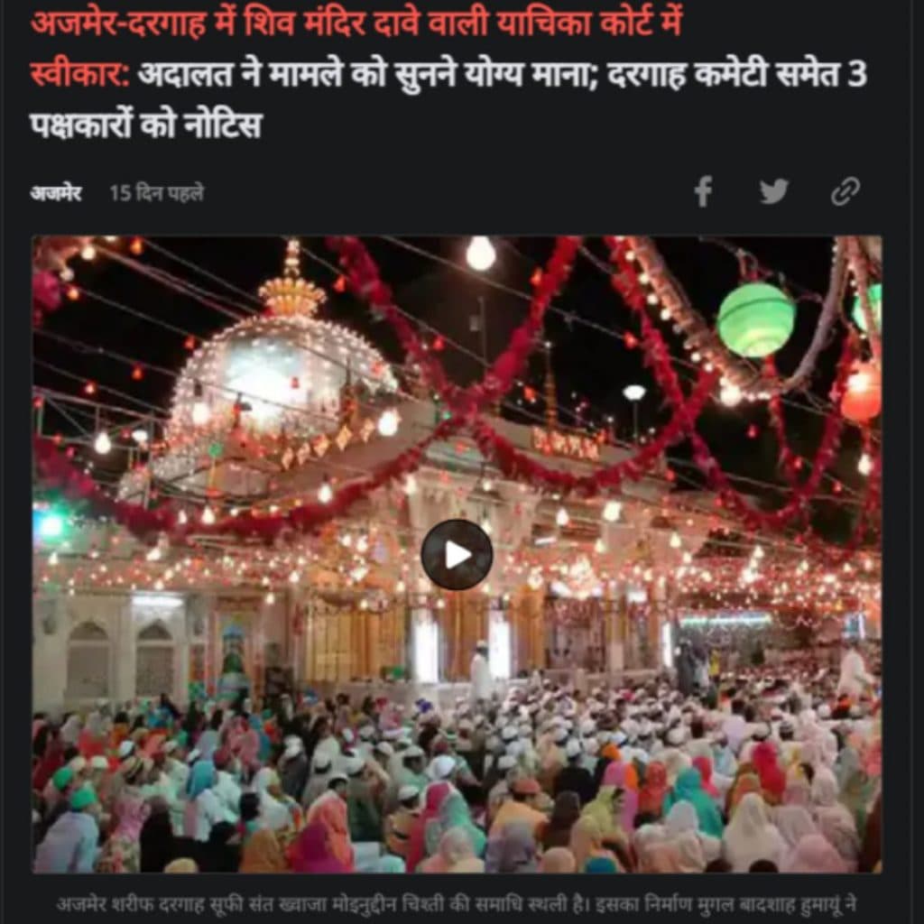 Fact Check: राजस्थान के अजमेर में ख्वाजा मोइनुद्दीन चिश्ती की दरगाह में संकट मोचन महादेव मंदिर होने का दावा करने वाली याचिका को अजमेर सिविल कोर्ट ने 27 नवंबर, 2024 को स्वीकार किया और इस संबंध में अल्पसंख्यक मंत्रालय, दरगाह कमेटी अजमेर और भारतीय पुरातत्व सर्वेक्षण विभाग को नोटिस जारी किया है. मामले में अगली सुनवाई 20 दिसंबर को होगी.