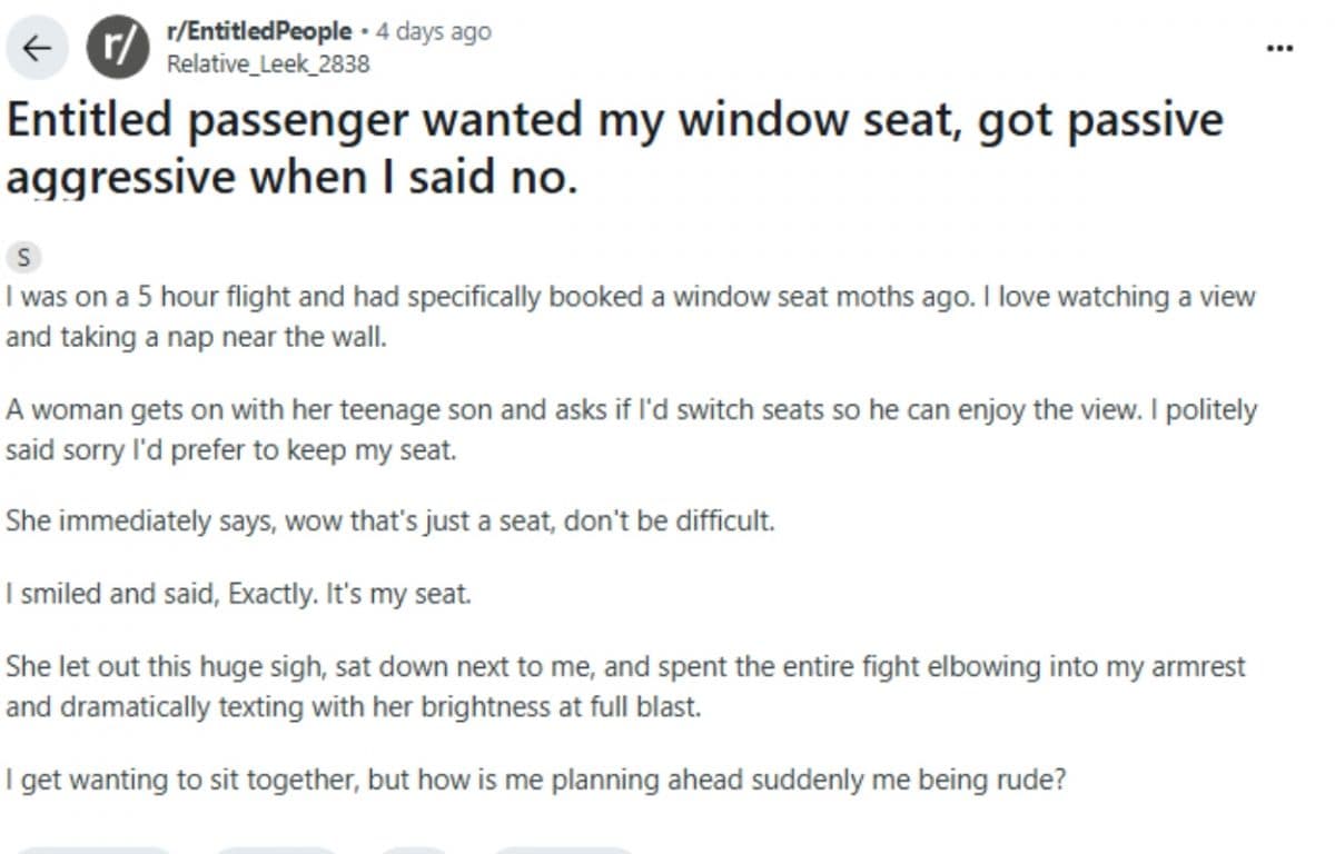 यूज़र ने बताया कि उसने एक महीने पहले फ्लाइट के लिए विंडो सीट बुक की थी. लेकिन उड़ान के दिन एक महिला अपने किशोर बेटे के साथ विमान में चढ़ीं और आते ही आग्रह करने लगीं कि उसका बेटा बाहर का नजारा देखना चाहता है कृपया सीट बदल दें. यूज़र ने विनम्रता से मना करते हुए कहा, “माफ कीजिए, मैं अपनी बुक की हुई सीट पर ही बैठना चाहूंगा.”