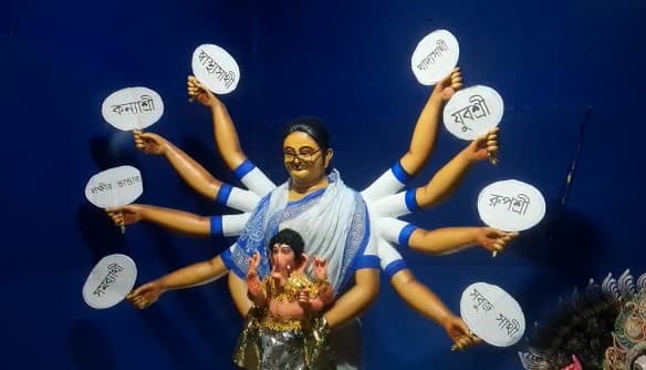 क्लब के पदाधिकारियों के मुताबिक सीएम ममता बनर्जी दस साल से ज्यादा समय से देवी दुर्गा की तरह पश्चिम बंगाल के लोगों की रक्षा कर रही हैं. यही कारण है कि सीएम ममता बनर्जी की तुलना देवी दुर्गा से की गई है. उनकी दस भुजाओं वाली प्रतिमा बनाई गई है. उनकी गोद में भगवान गणेश को रखा गया है. इससे किसी को भी दिक्कत नहीं होनी चाहिए. देवी दुर्गा के रूप में टीएमसी सुप्रीमो और मुख्यमंत्री ममता बनर्जी की प्रतिमा को नीले और सफेद रंग की साड़ी में दिखाया गया है. वहीं, प्रतिमा के दस हाथों में कन्याश्री योजना की तस्वीर समेत कई अन्य फोटो हैं.