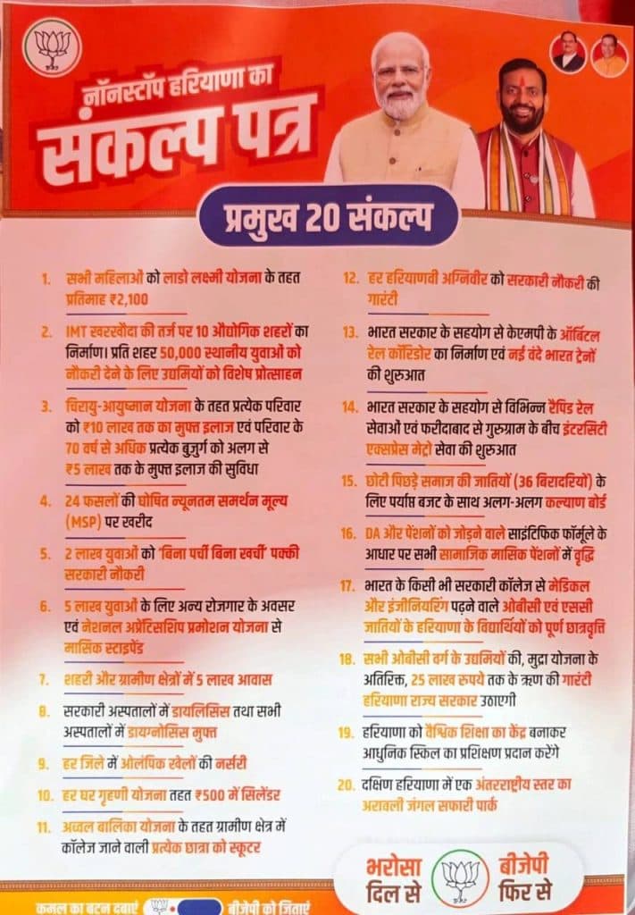 पार्टी का ‘संकल्प पत्र’ जारी करने के बाद केंद्रीय मंत्री और भाजपा के राष्ट्रीय अध्यक्ष जेपी नड्डा ने कहा, “कांग्रेस के लिए यह दस्तावेज (घोषणा पत्र) महज औपचारिकता है. उनके लिए यह दस्तावेज महज रस्म अदायगी है और उनके लिए यह दस्तावेज लोगों को धोखा देने के लिए है. 10 साल पहले हरियाणा की छवि क्या थी? हरियाणा की छवि ‘खारची’ और ‘पर्ची’ के आधार पर नौकरी पाने की थी. हरियाणा जमीन घोटालों के लिए जाना जाता था. हमारे लिए ‘संकल्प पत्र’ बहुत महत्वपूर्ण है. हम बिना रुके हरियाणा की सेवा कर रहे हैं.”