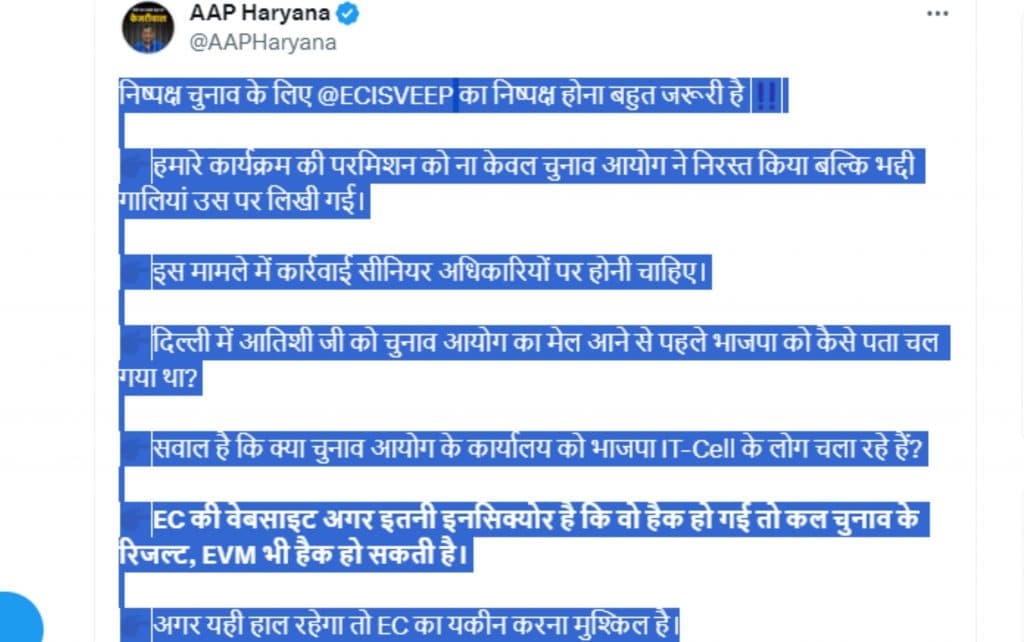 आम आदमी पार्टी की हरियाणा इकाई ने सोशल मीडिया प्लेटफार्म एक्स पर लिखा कि निष्पक्ष चुनाव के लिए चुनाव आयोग का निष्पक्ष होना बहुत जरूरी है. इसके साथ ही पार्टी ने लिखा कि…