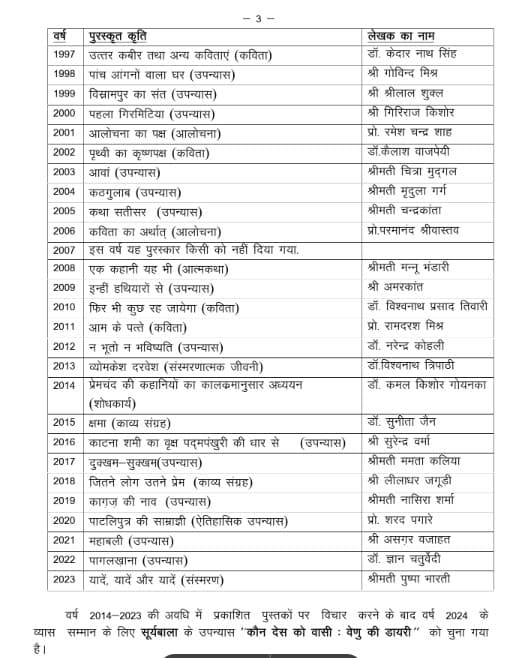 देश की जानी मानी लेखिका सूर्यबाला को 34वें व्यास सम्मान से नवाजा जा रहा है. केके बिड़ला फाउंडेशन ने एक बयान में बताया कि लेखिका को 2018 में आए उनके उपन्यास 'कौन देस को वासी: वेणु की डायरी' के लिए 2024 का व्यास सम्मान दिया जा रहा है.