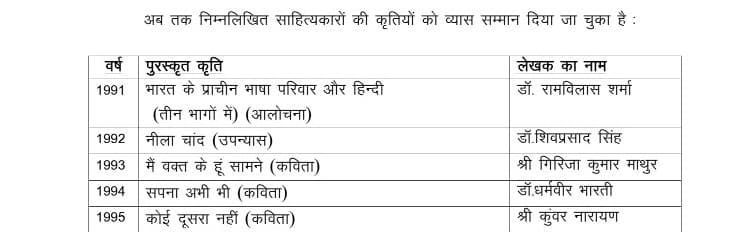 सृजनात्मक साहित्य के अतिरिक्त साहित्य और भाषा का इतिहास, आलोचना, निबंध और ललित निबंध, जीवनी आदि विधाएं भी इन सम्मानों के दायरे में आती हैं. हिन्दी में कई प्रतिष्ठित पुरस्कार हैं पर व्यास सम्मान की विशिष्टता यह है कि यह साहित्यकार को केन्द्र बिन्दु में न रखकर किसी एक साहित्यिक कृति को दिया जाता है. व्यास सम्मान के लिए कृति के चयन का पूरा दायित्व एक चयन समिति का है. जिसके अध्यक्ष हिन्दी साहित्य के प्रख्यात विद्वान प्रो रामजी तिवारी हैं.