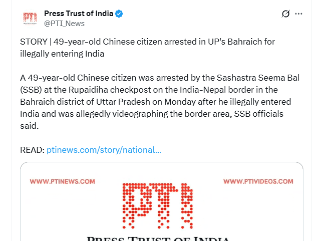 एसएसबी की 42वीं वाहिनी के सेनानायक गंगा सिंह उदावत ने न्यूज एजेंसी पीटीआई को बताया कि नेपाल से भारतीय सीमा में प्रवेश करने के बाद संवेदनशील इलाकों की वीडियो बना रहे एक चीनी नागरिक को सोमवार को पकड़ा गया. गिरफ्तार व्यक्ति की पहचान चीन के हुनान प्रांत के 49 वर्षीय लियू कुंजिंग के रूप में हुई है. अधिकारियों ने बताया कि उसे सीमा पर संदिग्ध गतिविधि करते देखा गया, जिसके बाद तुरंत हिरासत में ले लिया गया और जांच जारी है.