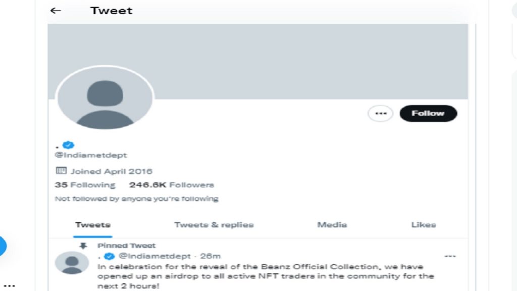 बताया जा रहा है कि हैकर्स ने आईएमडी के ट्विटर अकाउंट को हैक करके इस पर एनएफटी ट्रेडिंग शुरू कर दी. इसमें एक पिन किया गया संदेश दिखाई दे रहा है, जो किसी एनएफटी ट्रेडिंग से जुड़ा है. संदेश में लिखा है, बीन्ज ऑफिशियल कलेक्शन के सामने आने के मौके पर हमने अगले 2 घंटे के लिए कम्युनिटी के सभी सक्रिय एनएफटी ट्रेडर्स के लिए एक एयरड्रॉप खोल दिया है! शुरुआत में इसका प्रोफाइल फोटो बदल दिया गया था. हालांकि, अब खाली नजर आ रहा है. मौसम विभाग की कोशिशों के बावजूद अभी तक इसे दोबारा हासिल नहीं किया जा सका है.