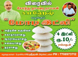 भाजपा नेता महेश ने मोदी इडली की शुरुआत की है. पोस्टर में लिखा गया है कि सांबर के साथ चार इडली मात्र दस रुपये में. सलेम में जल्द ही दस रुपये में चार इडली खाने की सुविधा उपलब्ध होगी. पोस्टर में बताया गया है कि मोदी इडली को आधुनिक रसोई के उपकरणों में तैयार किया जायेगा. इसलिए यह ज्यादा स्वादिस्ट और पौष्टिक होगा. बता दे कि सलेम तमिलनाडु के मुख्यमंत्री पलानीस्वामी का पैतृक जिला है.