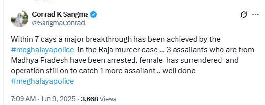 मेघालय के मुख्यमंत्री कॉनराड के. संगमा ने इस मामले में बड़ी सफलता के लिए मेघालय पुलिस की तारीफ की. उन्होंने सोशल मीडिया प्लेटफार्म एक्स पर लिखा, “राजा मर्डर केस में मेघालय पुलिस ने 7 दिन में बड़ी सफलता पाई है. 3 आरोपी जो मध्यप्रदेश के हैं गिरफ्तार हो चुके हैं, महिला ने सरेंडर किया है और एक आरोपी की तलाश जारी है. शाबाश मेघालय पुलिस…”
