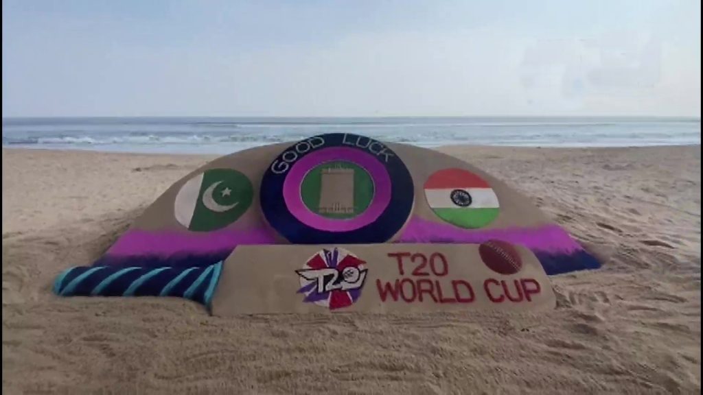 सुदर्शन पटनायक ने दोनों देशों के खिलाड़ियों को शुभकामनाएं देते हुए दोनों देशों के राष्ट्रीय ध्वज और टी-20 विश्वकप का लोगो बालू पर उकेरा है. सुदर्शन पटनायक ने बैट पर टी-20 विश्वकप लिखा है और बाॅल की आकृति भी बनायी है.
