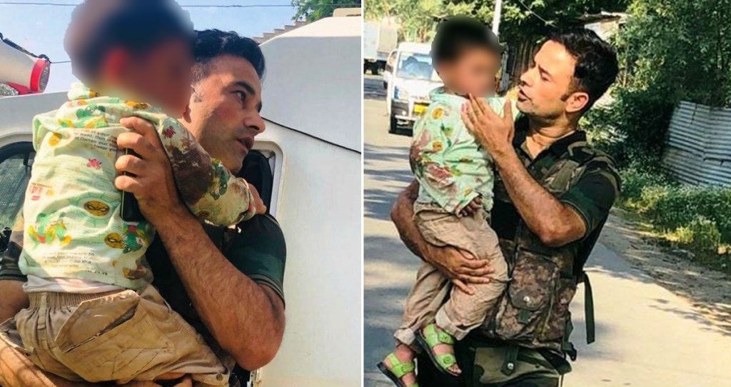 तस्वीरें सोशल मीडिया पर वायरल हो रहीं हैं. सोशल मीडिया से ही पता चला कि दोनों दादा-पोते हैं. आतंकियों की गोलीबारी के दौरान आई यह तस्वीर तेजी से वायरल हो रही है. जवान इस फोटो में बच्चे से बात भी कर रहा है. बच्चे के चेहरे की मासूमियत और जवान की उससे बात करते हुई तस्वीर छू रही है. बता दें कि जम्मू कश्मीर में अब आतंकी आम नागरिकों को निशाना बना रहे हैं क्योंकि भारतीय सशस्त्र बल उन पर कहर बन कर टूट रहे हैं.