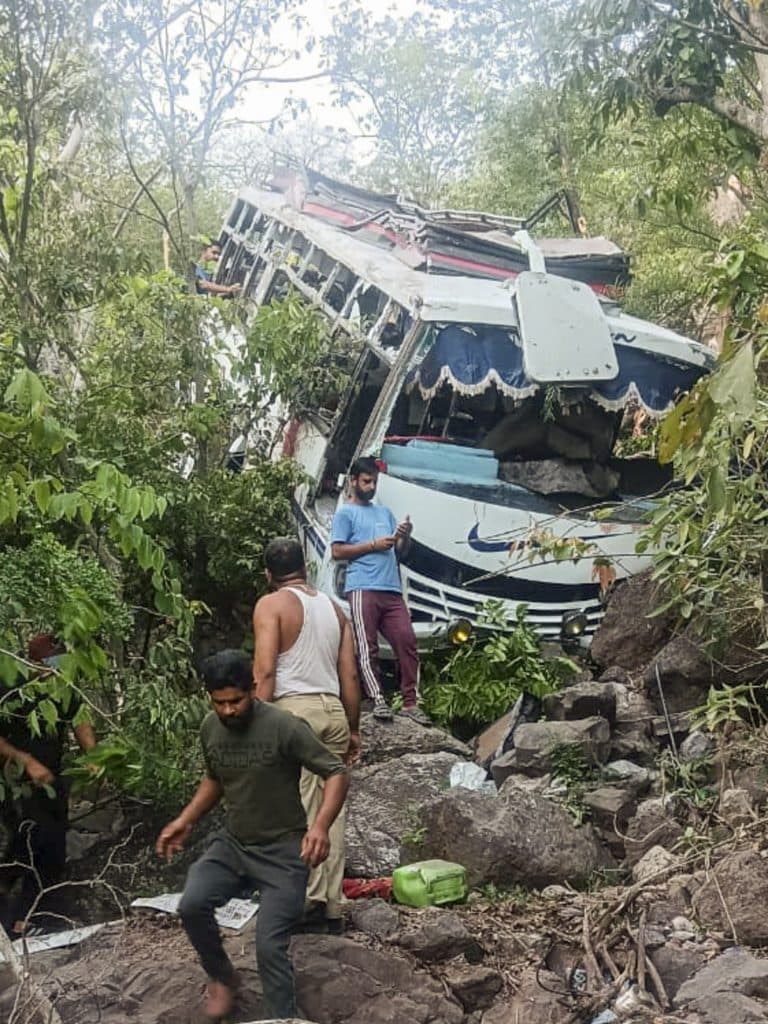 Reasi: The damaged bus after it plunged into a gorge following an alleged attack by suspected terrorists, in Reasi district of Jammu and Kashmir