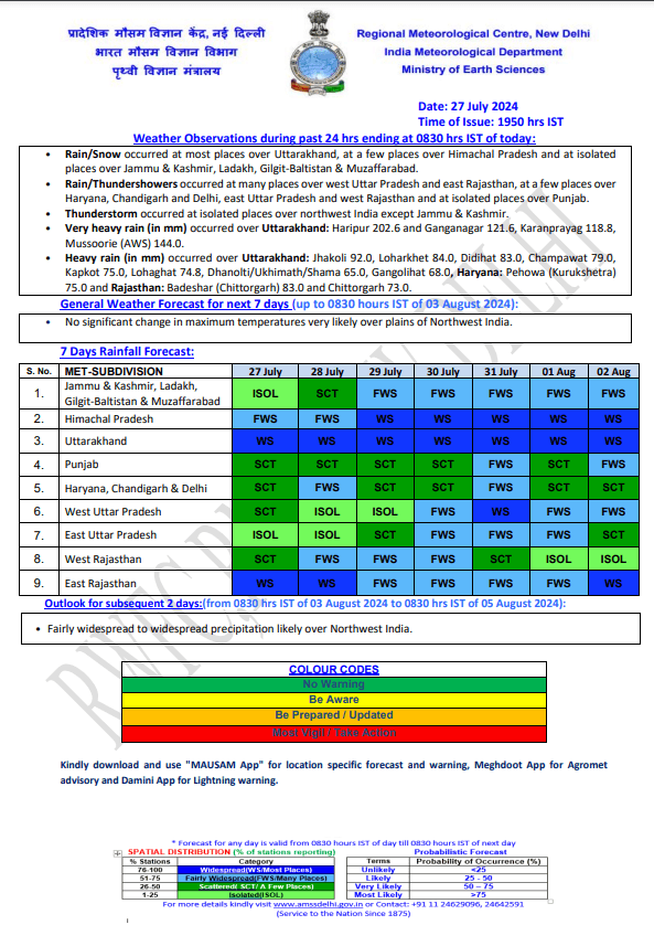 मौसम की जानकारी देने वाली निजी संस्था स्काइमेट वेदर के अनुसार, 29 जुलाई को मध्य प्रदेश, विदर्भ, उत्तरी मध्य महाराष्ट्र के साथ-साथ पूर्वी राजस्थान, गुजरात क्षेत्र और तटीय कर्नाटक में मध्यम से भारी बारिश की संभावना है. वहीं केरल, जम्मू कश्मीर, हिमाचल प्रदेश, उत्तराखंड, सिक्किम, असम, पश्चिम बंगाल में हल्की से मध्यम बारिश के साथ एक या दो बार भारी बारिश देखने को मिल सकती है.