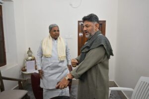 कर्नाटक के उपमुख्यमंत्री डी.के. शिवकुमार ने ट्वीट करते हुए लिखा, “आज सुबह ब्रेकफ़ास्ट के लिए कावेरी रेसिडेंस पर मुख्यमंत्री सिद्धारमैया से मुलाकात हुई. कर्नाटक की प्राथमिकताओं और आगे के रास्ते पर एक अच्छी चर्चा हुई. माना जा रहा है कि दोनों के मुलाकात के पीछे कांग्रेस के टॉप लिडरशिप का बड़ा हाथ है. डीके शिवकुमार जल्द ही दिल्ली जाकर पार्टी के सीनियर नेताओं के साथ मिल भी सकते हैं.