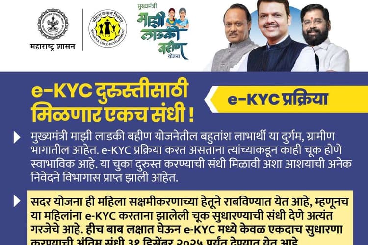 Ladki Bahin Yojana : मुख्यमंत्री माझी लाड़की बहिन योजना को लेकर एक अहम जानकारी मंत्री अदिति एस तटकरे ने सोशल मीडिया प्लेटफॉर्म एक्स पर दी है. उन्होंने एक्स पर लिखा–लाड़की बहिन योजना के तहत ई-केवाईसी (e-KYC) प्रक्रिया को लेकर एक महत्वपूर्ण जानकारी शेयर कर रही हूं. इस योजना के अधिकतर लाभार्थी दूर-दराज और ग्रामीण इलाकों से हैं, इसलिए ई-केवाईसी करते समय कई महिलाओं से अनजाने में गलतियां हो गई हैं. विभाग को ऐसी कई शिकायतें और आवेदन मिले हैं, जिनमें इन गलतियों को सुधारने का मौका देने की मांग की गई थी.