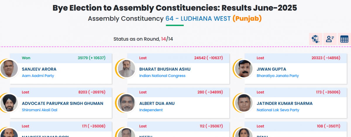 Ludhiana By Election Result 2025 : लुधियाना उपचुनाव में आप ने मारी बाजी, कांग्रेस दूसरे स्थान पर, बीजेपी तीसरे स्थान पर